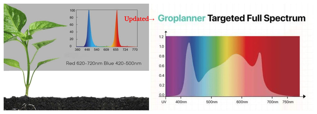 For photosynthesis, plants use light in the PAR(photosynthetic active radiation) region of wavelengths (400nm-700nm) and includes red, blue and green wavebands, measured in nanometers (nm) .The growth of plants mostly depends on the red and blue light. The earliest led grow light all based on the spectrum of these two wavelengths. With in-depth research, it has been found that far-red light is closely related to the potential for yield and control growth. So Groplanner LED grow light have updated to targeted full-spectrum grow lights for increasing the yield and quality.